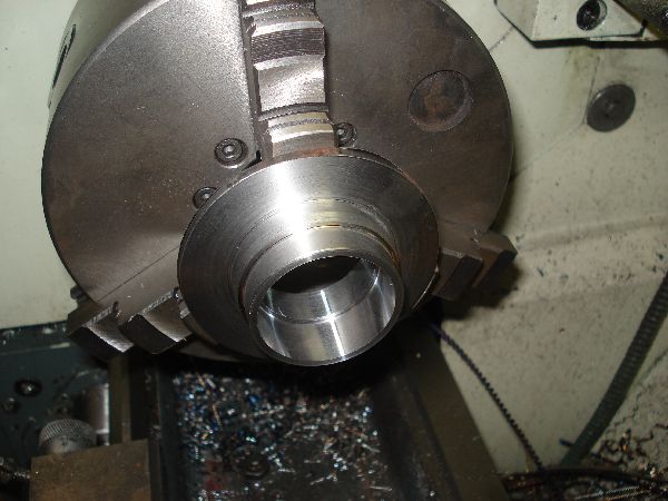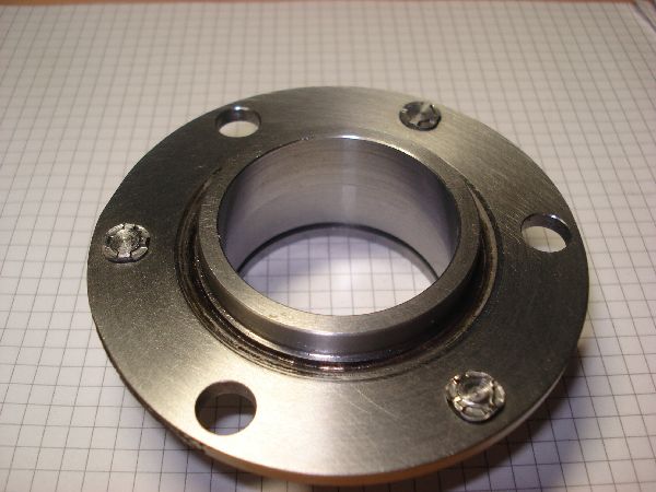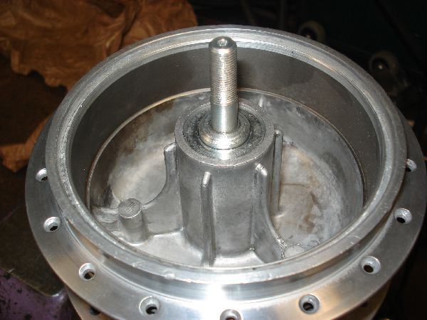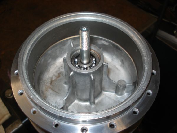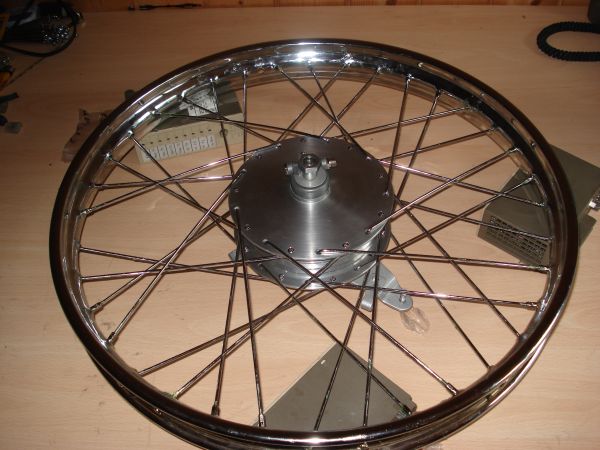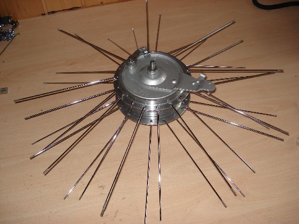 Am Hinterad hatte leider der Lagersitz am Mitnehmerflansch des Kettenrads viel zu viel Spiel, so dass das Kettenrad eierte, und so die Mitnehmergummis zerstörte. Zuerst wollte ich nur einen neuen Lagersitz einlöten, musste das Teil schlussendlich doch komplett neu anfertigen, da es verzogen war und so kein ordentlicher Rundlauf für das Kettenrad hergestellt werden konnte. Für das Vernieten der drei Mitnehmerbolzen musste ein spezieller Nietendöpper gebaut werden. Das Hinterrad konnte mittlerweile fertig montiert und eingespeicht werden.