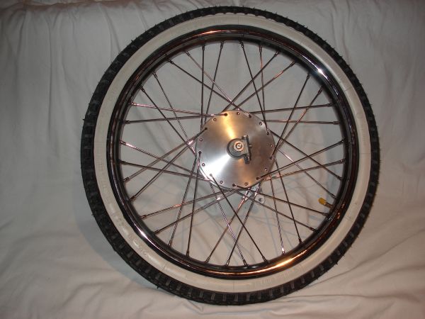 Die Räder speichte ich selber ein, das ist gar nicht so schwierig wie ich zuerst befürchtet habe. Ich kann nur empfehlen es mal selber zu probieren. Wichtig ist, dass man die Nippel etwas einfettet und nicht zuviel aufs Mal korrigieren wil. Um die Zentrierarbeiten gut erledigen zu können, habe ich mir einen stabilen Zentrierständer gebaut. Die Felgen konnte ich bis auf ca. 0.2mm Seiten- und Höhenschlag einstellen. Anschliessend wurden noch die neuen Weisswandreifen aufgezogen.